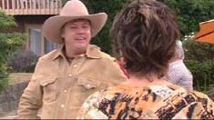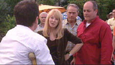 At the General Store, Joe explains to Sky that he had to come to town when he heard about Annalise’s documentary, quickly adding that he wanted to visit her too. He asks whether the guy behind her is this “Floyd” she’s been going on about, and she corrects the name and also mentions that they’re no longer together. Sky explains that Boyd is now with Kayla, who is sitting holding Ashley. Joe none-too-subtly asks Sky if Kayla is over 16 and Boyd looks annoyed. Sky is trying to tell Joe what’s happened, but Joe assumes that “Floyd” dumped Sky then went and got Kayla pregnant. Sky tells him that Boyd isn’t the father, but he’s trying to do the right thing by Kayla. Harold then appears from the kitchen and Joe shouts “Hazza” and starts prodding Harold in the stomach. Joe explains to Harold that he’s come down to appear in the documentary and be famous. He says that he stands a good chance of fame, what with being so good looking and having such a good looking daughter. Sky hugs him again.