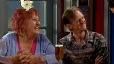 Back at Scarlet Bar, Toadie has bought another round of drinks, and takes a glass of champagne and a beer over to his mum & dad, but Kev refuses as he has to drive. Toadie is surprised that they are leaving so soon, but they tell him that they never get to spend enough time with him, which is why he is going with them, much to his horror. They shout over to Stuart that they are going to drop him off at Oakey, but as Toadie tries to come up with an excuse, Stuart can’t wait to go for a ride in the Big Rig.