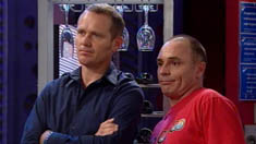 Outside of Grease Monkeys, Kim & Dylan are sitting at a table watching their workforce move the DVD’s from one vehicle to another. Kim says that Boyd is a good kid, but he and Janae are too young, in a bit to point out his father’s hypocrisy, Dylan asks how old he and Janelle were, but Kim says that was different. Kim wonders what is wrong with him, as he didn’t even seem to care about Janae's engagement. He says if she wants to ruin her life, it’s up to her, and quickly points out that a police car has just pulled into the street. Kim begins to panic, saying they should warn the guys but Dylan says they can’t be seen anywhere near them. Kim refuses to listen, saying that they’ll drop them in it if they are caught, but Dylan says they won’t. Just then, the policeman gets a call on his radio and drives off with their sirens on, much to Kim’s relief. Dylan mocks his father, but Kim says they could’ve been arrested. Worried by his son’s involvement, Kim tries to put a stop by the whole scheme, but Dylan informs him that it isn’t his business anymore and he’ll do what he tells him. Kim looks shocked by his son’s behaviour.