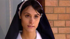 At Saint Clare’s Convent, Connor pulls into the car park and gets out of his ute. As he stops to looks at the sign, he sees someone who he thinks is Carmella. He runs up to her, but is disappointed when the person turns around and it isn’t Carmella. He apologises, but soon hears a voice he recognises call his name, he looks around and is shocked to see Carmella walk up to him dressed as a novice. Shocked, and overwhelmed as she thought Connor to be dead, Carmella runs up and hugs him.