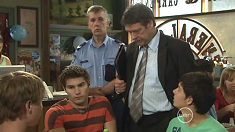 At the police station, Alec questions Declan, Ringo and Zeke. He asks Declan why he left the formal early. Ringo explains that Chris has a bad reputation, so Skinner asks if that is why he and his friends went looking for him. He explains to Declan that they found Chris' car in the Lassiter's lot, windows broken and tyres slashed. Declan tells him that he knows nothing, but Alec says that the hotel night staff saw a young man in the car park last night. They were able to make a detailed physical description and Declan fits the bill. And with his past record, his latest actions might blow Declan's good behaviour bond. Skinner explains the seriousness of Chris' condition and tells Ringo that he isn't blaming him, but if he knows something and doesn't tell him, Ringo will become an accessory to the crime. Ringo and Zeke have nothing else to add, with Zeke explaining that after they didn't find Chris, he hooked up with Taylah and went home. Skinner almost catches Declan out in a lie, when Declan claims that he, Zeke and Taylah went him together, but Paul corroborates Declan's story.