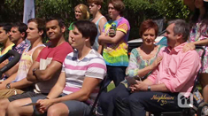 Paul starts his welcome speech: "Well, welcome everybody to the inaugural Erinsborough Festival. Two whole weeks of cultural events celebrating this special community that I