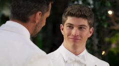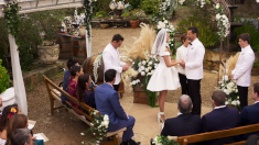 There is a brief delay in the ceremony as Aaron becomes emotional and David passes him a handkerchief, much to the amusement of the guests gathered. After