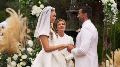 towards a waiting Pierce. He wishes her good luck before taking the bouquet from her and standing to one side, allowing Pierce to comment on how perfect