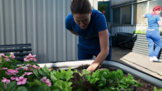 In the garden at Goodwood Prison Elly is planting the aster flower in one of the raised flower beds as Andrea sidles over to her. She asks a nervous Elly