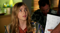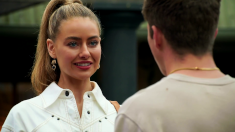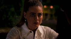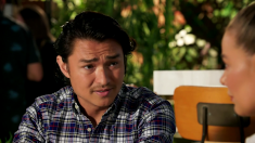 Chloe escapes to the Waterhole and sees Leo drinking wine outside. Seeing how downhearted Chloe looks, Leo wordlessly offers her his wine glass for her to