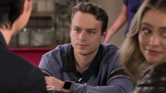 Leo watches across the complex, as Seb sits outside Harolds looking at his phone. He sees Nic walk out of the cafe and nods at her, so she walks over to