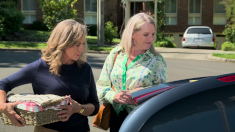 On Ramsay Street, Melanie has arrived with pastries for Jane and some more for the Rodwells. They, along with Karl and Susan, look across the street at the