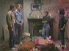 A squat house: Sonia tells them that Kim was there, but now she's gone. Paul explains that he's Scott's brother. The girl calls into the back, and Kim is there after all. Kim insists that she won't go back but she will call Scott. Also that it has nothing to do with Scott - she's often thought of running away. Paul says that she can't go on living here but Kim says she'll get a job and survive. Father Barry says she can get in touch if she needs anything. Father Barry drags Paul away sensing the situation is getting tense.